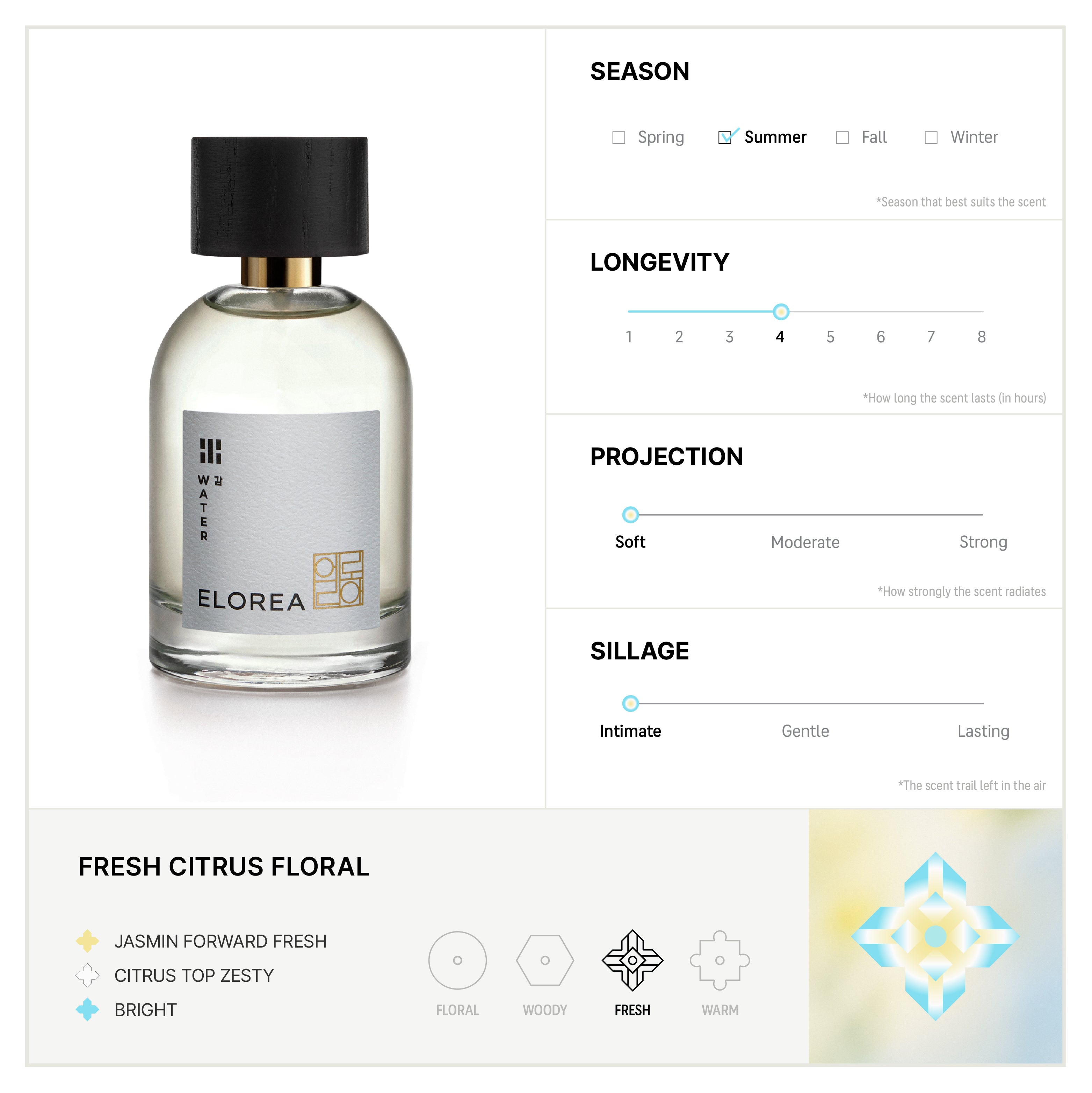 뿌리는 순간 기분이 좋아지는 밝은 향 입니다. 상큼한 시트러스 향이 코끝을 스치다가 깊고 풍부한 화이트 보테니컬 향기와 어우러집니다. 매혹적인 자스민과 백장미의 향이 버가못과 귤의 싱그러움과 조화를 이루고, 보드라운 화이트 머스크와 편백나무 향으로 이어집니다.