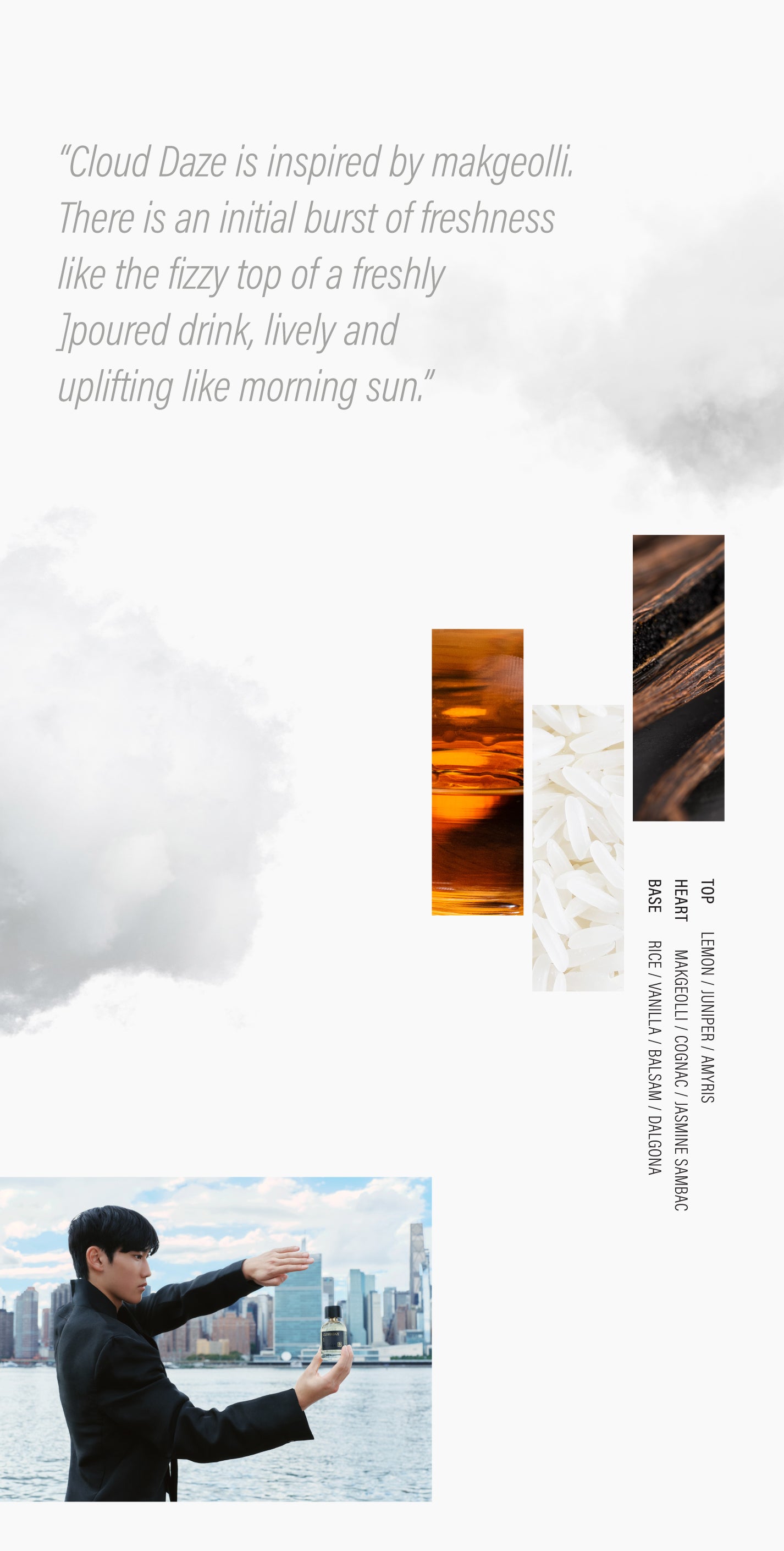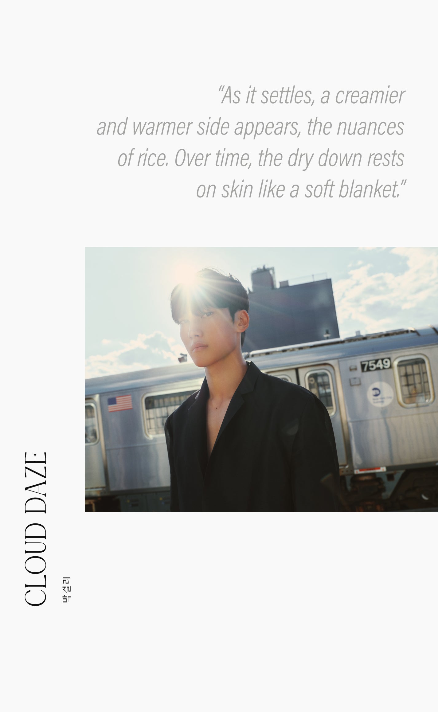 Cloud Daze; 막걸리는 부드럽고 은근한 달콤함이 매력적인 향으로, 우리나라 전통주에서 영감을 받았습니다. 가볍고 크리미한 질감 속에 달달한 산미가 어우러져, 익숙하면서도 포근하고 중독적인 무드를 완성합니다.