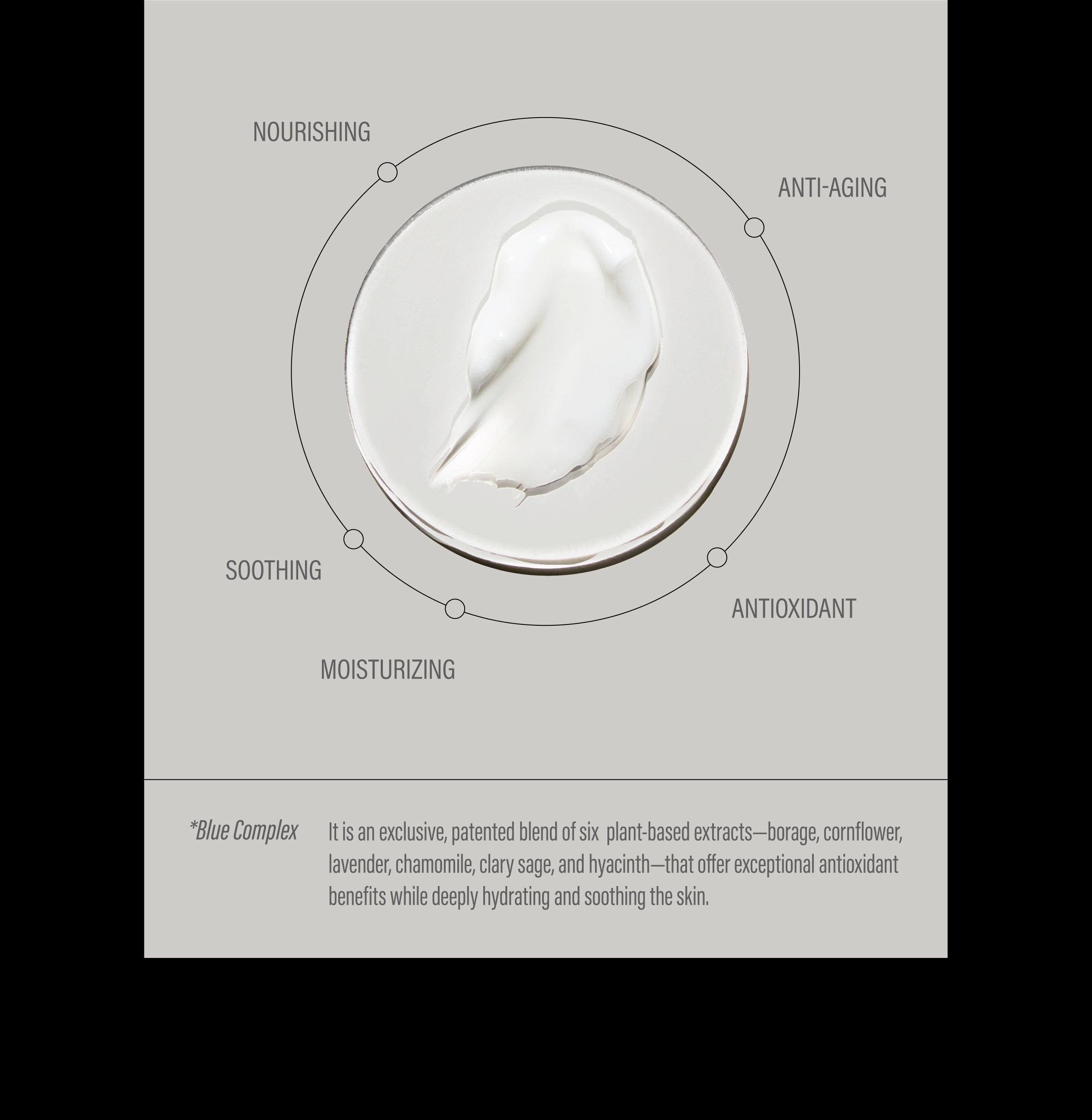 Blue Complex*: A patented blend of six botanical extracts—borage, cornflower, lavender, chamomile, clary sage, and hyacinth—renowned for their antioxidant-rich, soothing, and deeply moisturizing properties.