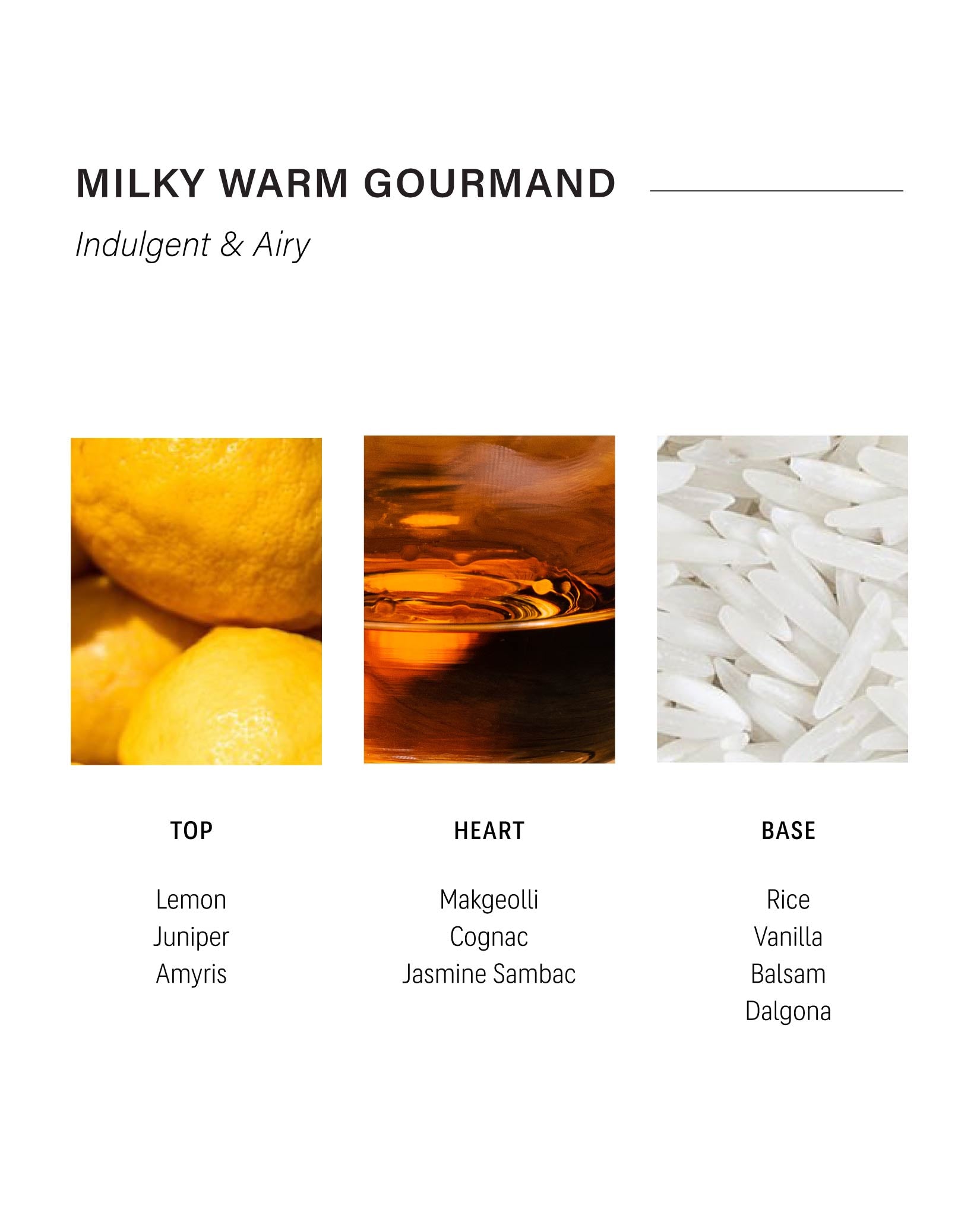 It begins with a bright, lightly sweet opening of fresh juniper and the smooth warmth of amyris. In the heart, makgeolli and cognac create a mellow depth with just the right touch of charm. As the fragrance settles, a delectable blend of vanilla, rice, and dalgona comes forward. The finish is sweet but never overpowering—elegant, balanced, and addictive.