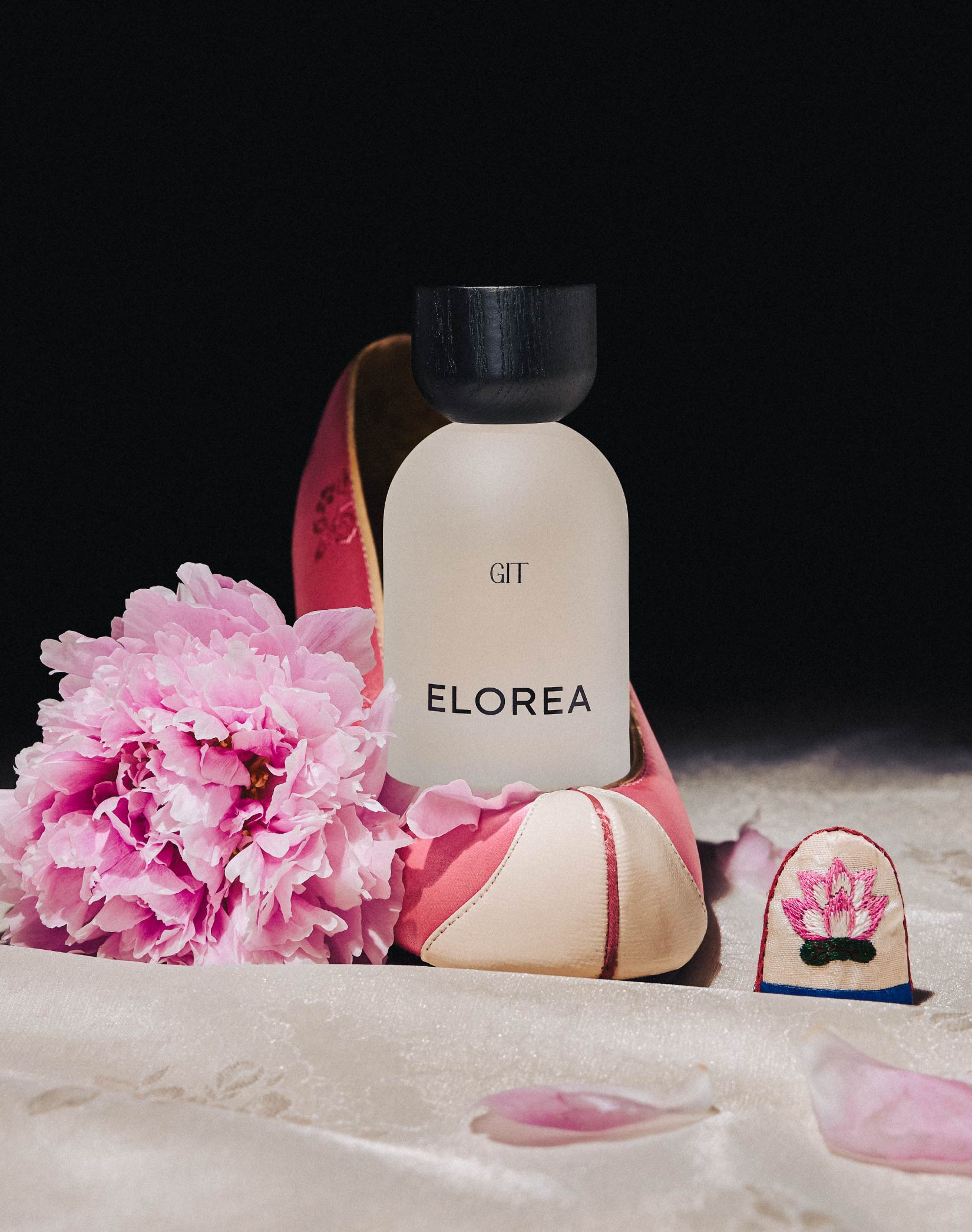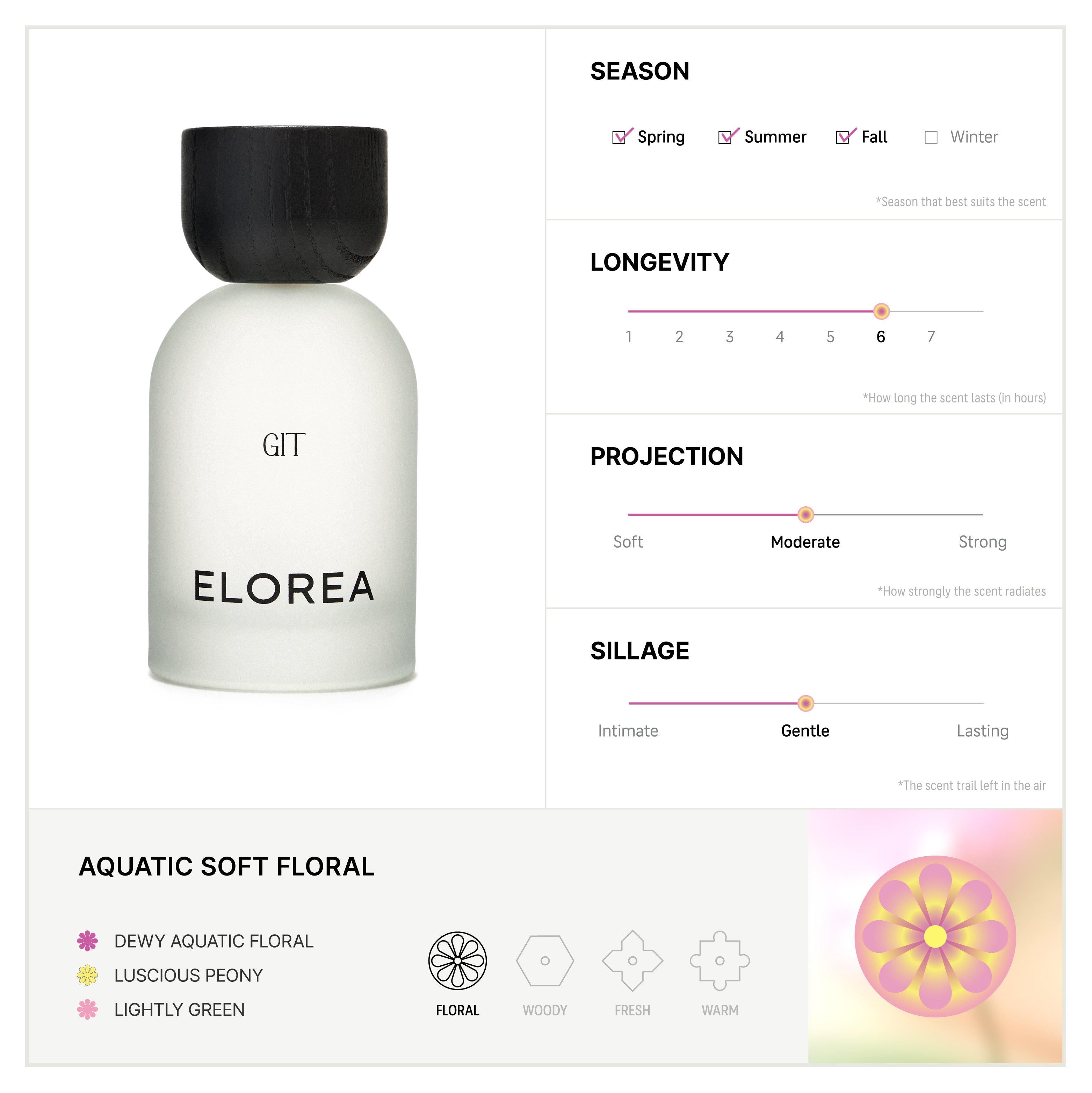 ‘GIT’ is a sophisticated floral scent inspired by the elegance of traditional Korean clothing, Hanbok. A ‘Git’ represents the unique collar design of a Hanbok, and there's a Korean saying: “even a fleeting touch of git signifies fate”, which emphasizes the significance of every interaction. This perfume captures that sentiment with the unforgettable scents of peony and lotus, often seen in the patterns of Hanbok as a symbol of prosperity and purity. With the additional hints of rose, iris, and lychee, the formulation creates a fresh floral with a beautiful musk at dry down.