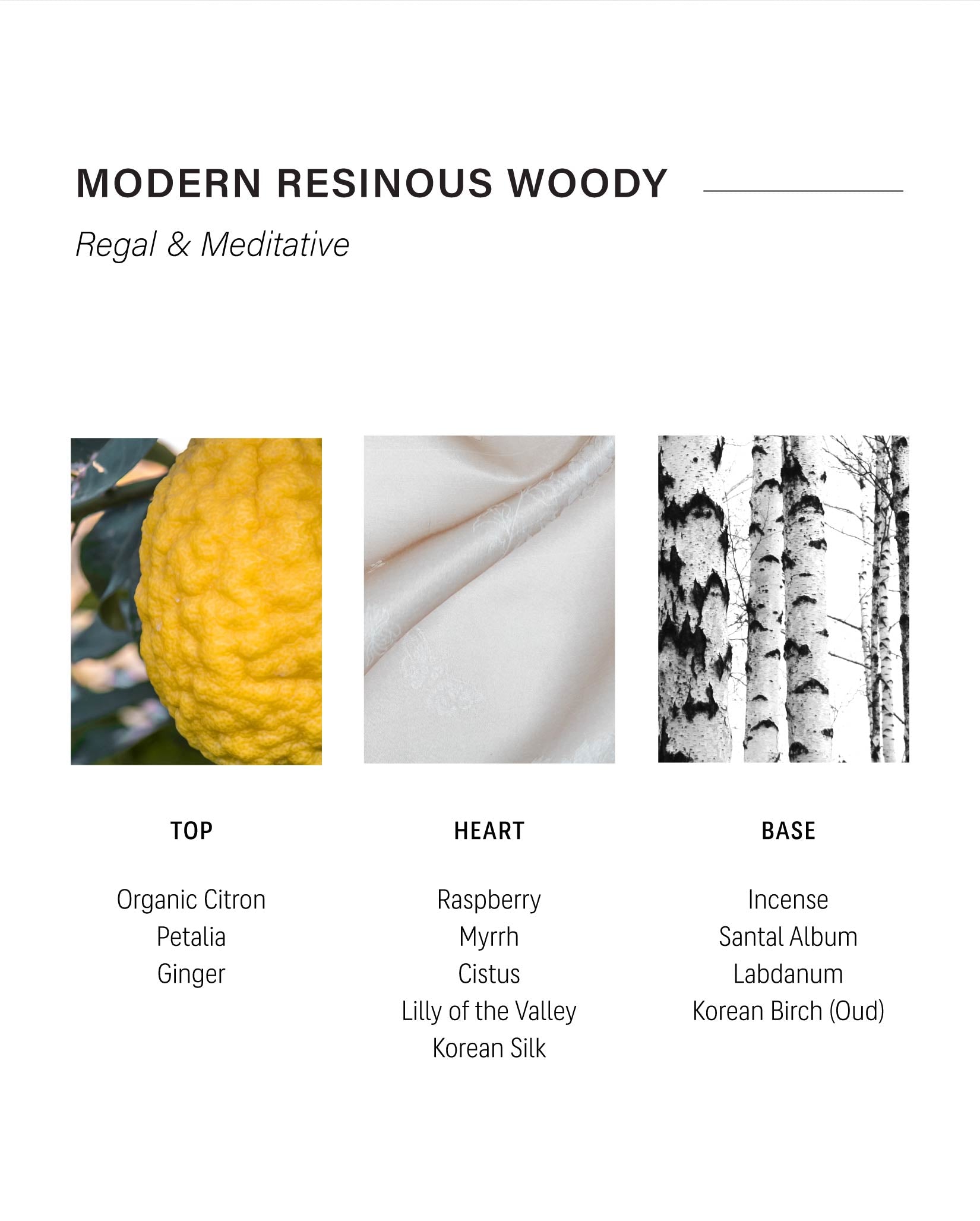 The fragrance is refined, regal, and calmingly sensual. Its resinous heart is perfectly balanced by the brightness of citron and raspberry, while delicate florals and the smoothness of Korean silk accord lend a polished, luxurious texture. Incense and woods ground the composition, evoking the sacred stillness of ancient temples with layered depth and complexity.