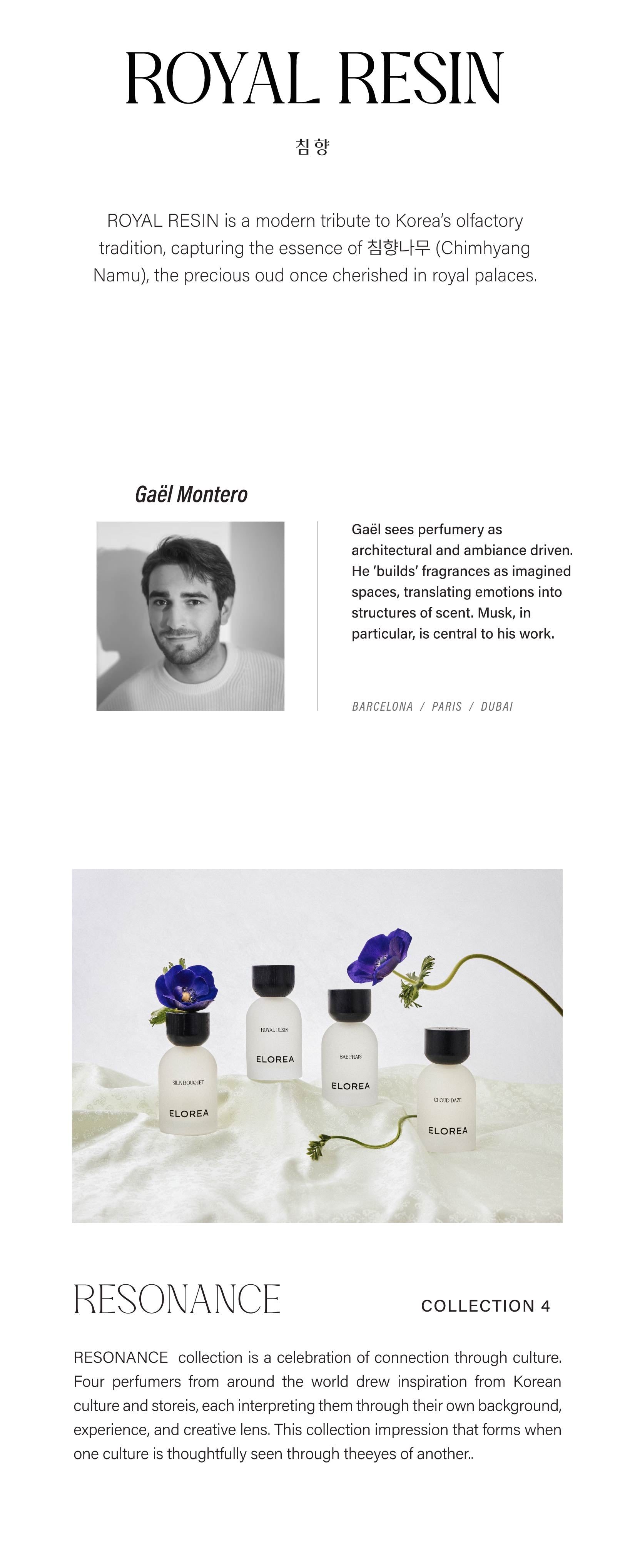 Royal Resin is a modern tribute to Korea’s olfactory tradition, capturing the essence of chimhyang namu—the precious oud once cherished in royal palaces. This rare wood was esteemed for its deep, meditative scent and symbolic ties to serenity, longevity, and spiritual depth.