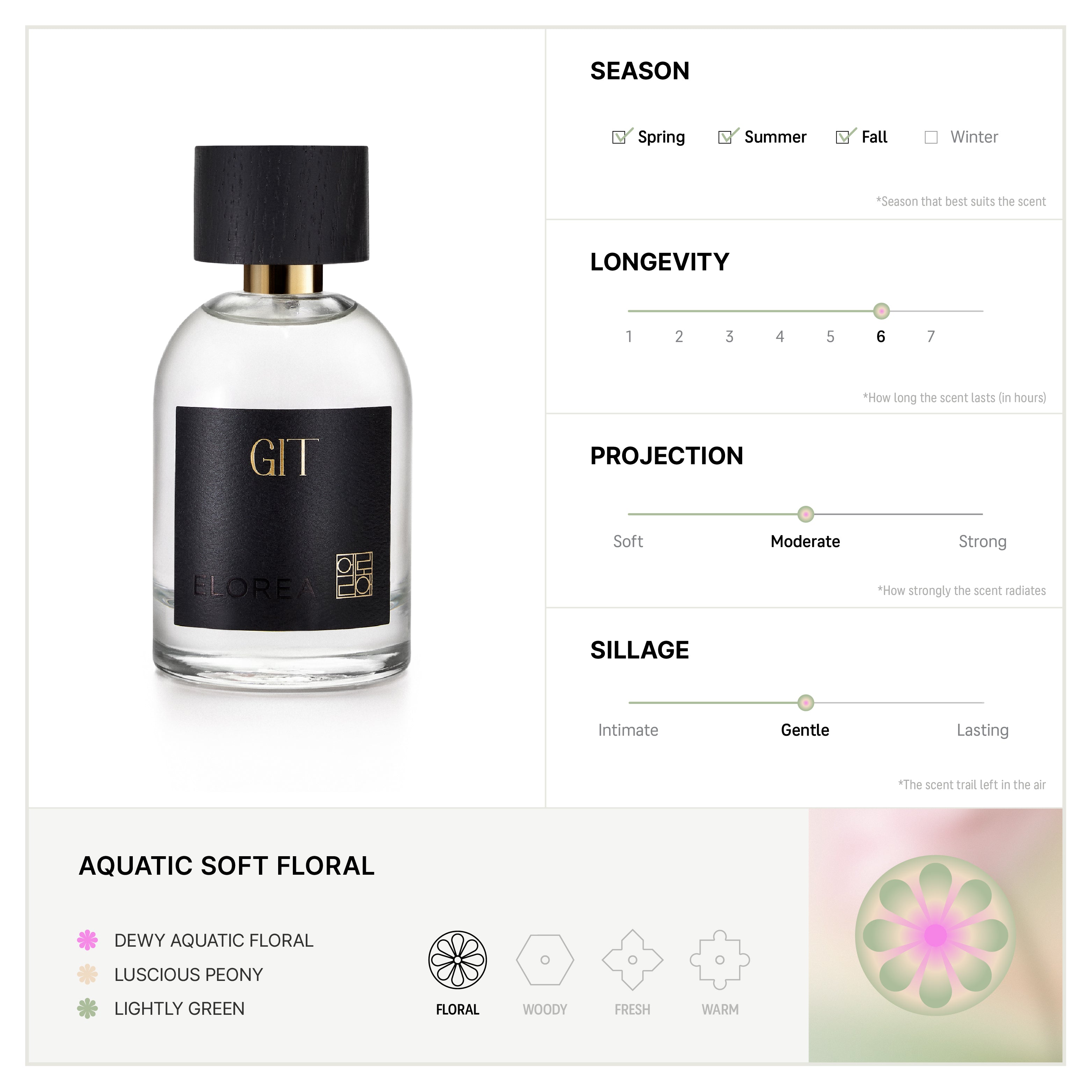 'GIT'은 한복에서 영감을 받은 우아하고 섬세한 향입니다. 한복의 상징인 '깃'을 주제로 '옷깃만 스쳐도 인연'이라는 옛말을 로맨틱한 감성으로 재해석했습니다. 한복 무늬나 자수로 자주 볼 수 있는 모란과 연꽃의 향이 장미, 아이리스, 리치의 향과 더해져 풍성하면서도 산뜻한 꽃향을 선사합니다. 마무리는 실키한 머스크로 살결에 은은하고 오래 잔향이 남으며, 특별한 조향기술로 심신 안정효과도 있습니다.