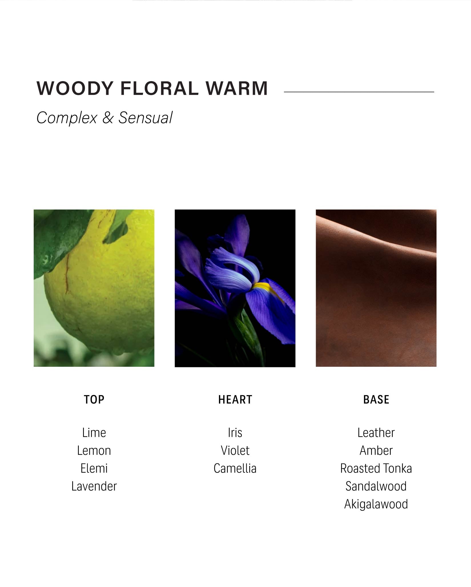 Unique, alluring, and mysterious. This intriguing scent begins with a light citrus and freshness of elemi, balanced with complex floral notes of iris, violet, and camellia. As the seductive florals begin to settle; amber, roasted tonka, and leather warm up. Sandalwood and akigalawood add a creamy finish to this addictive scent.